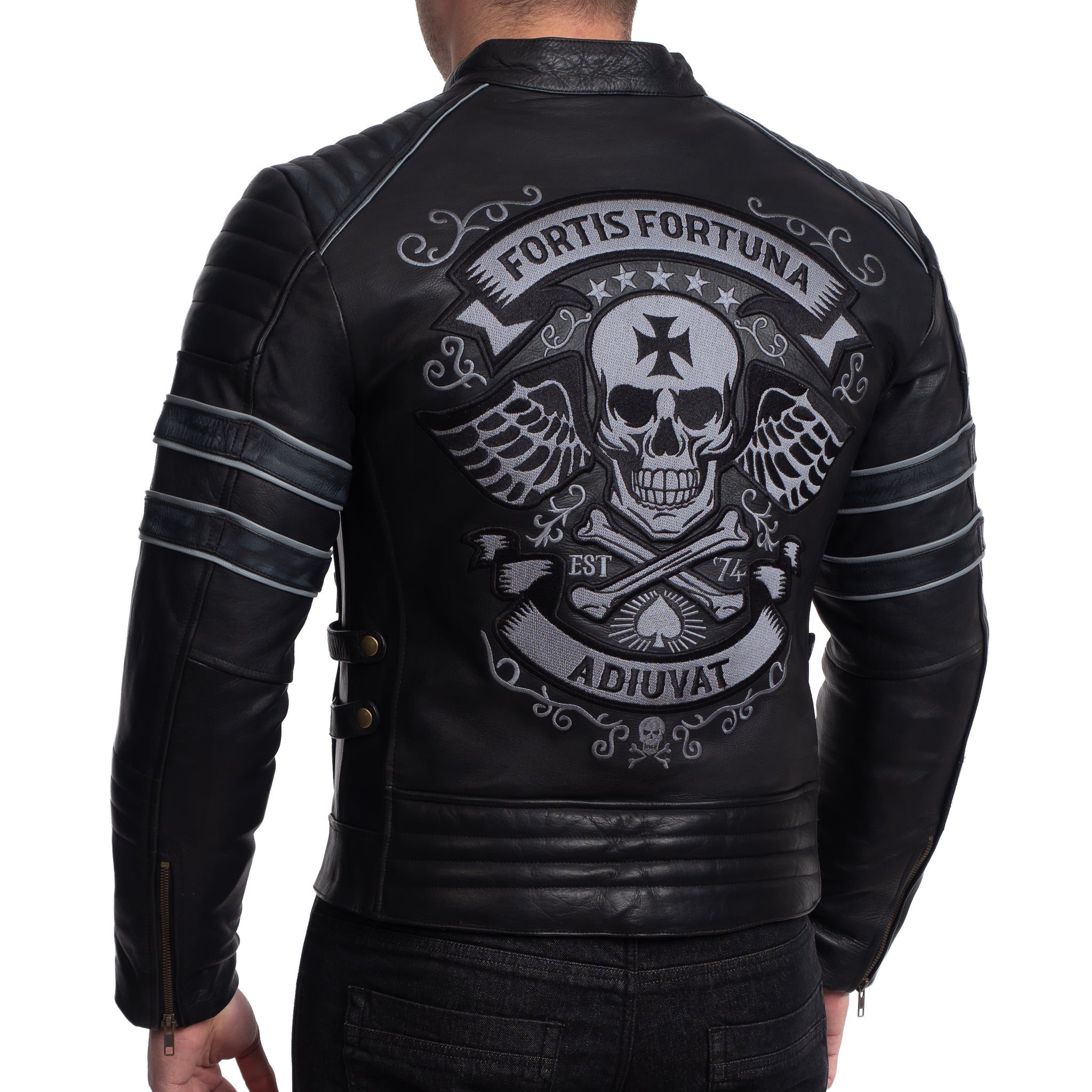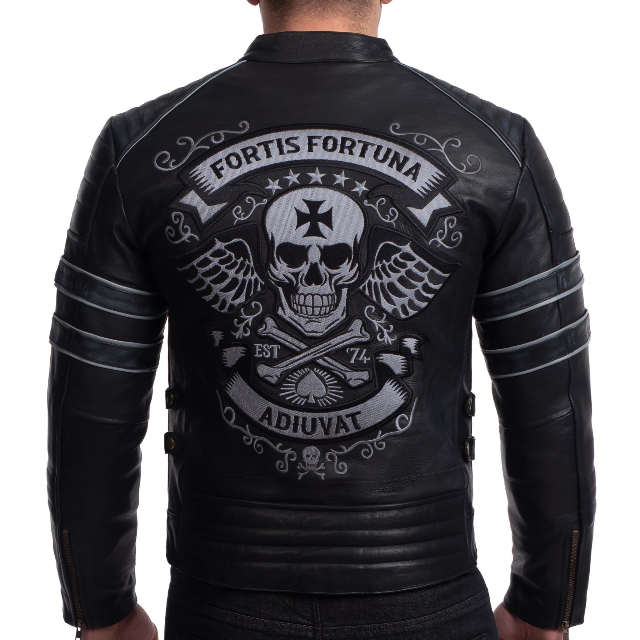 Ce blouson en cuir présente une coupe sportive et un message brodé en latin, « Fortis Fortuna Adiuvat » (« La fortune sourit aux audacieux »), un sentiment toujours d’actualité.